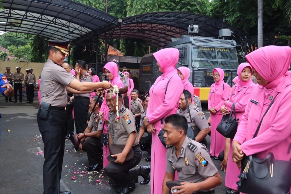 Prosesi kenaikan pangkat dipimpin langsung Kapolres AKBP Wahyu S Bintoro, SH SIK MSi, dengan menyiram anggota yang naik pangkat dengan air kembang. Saat diguyur air kembang, anggota dalam posisi jongkok dan didampingi istri masing masing.
