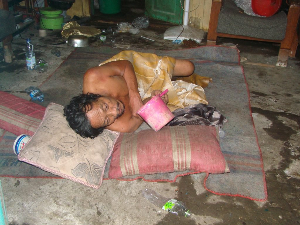Sehari hari, Sudaryono hanya berbaring beralaskan tikar dan bantal sambil telanjang di ruang tamu rumahnya. Tubuhnya hanya ditutupi sehelai selimut kecil. Di ruangan semi permanen itu, bau pesing sangat menyengat.