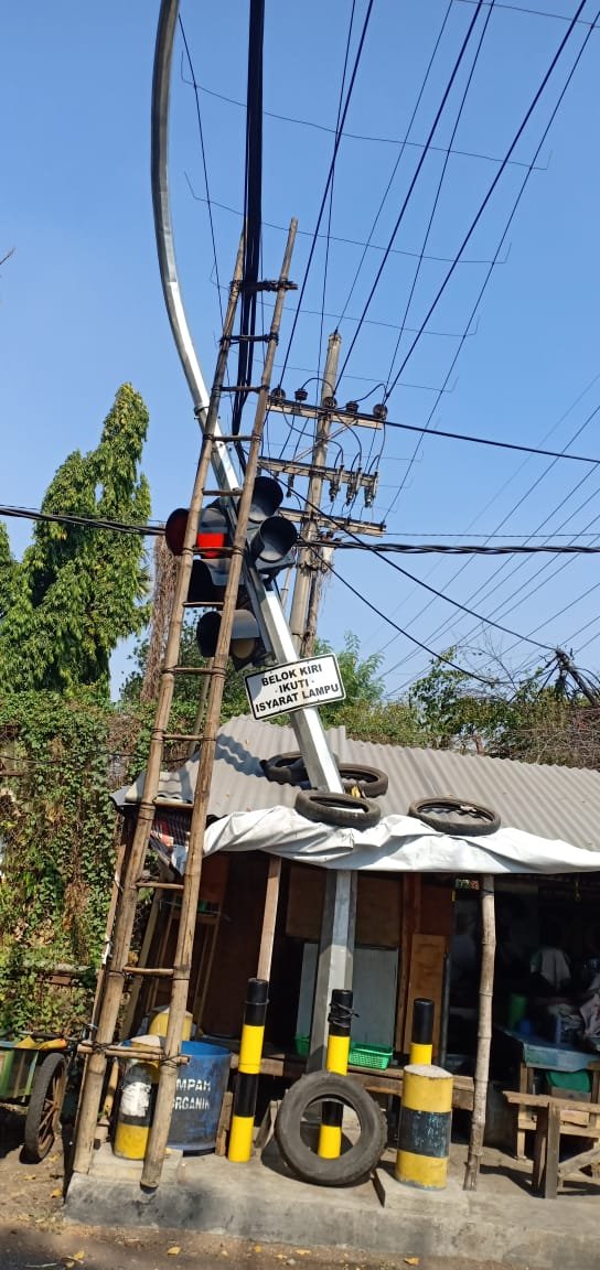 Hingga Kamis sore, kondisi TL yang roboh masih tergeletak. Demikian uga dengan kabel yang membentang Jl Noto Prayitno masih diberi pengaman daruruat berupa anak tangga dari bambu.