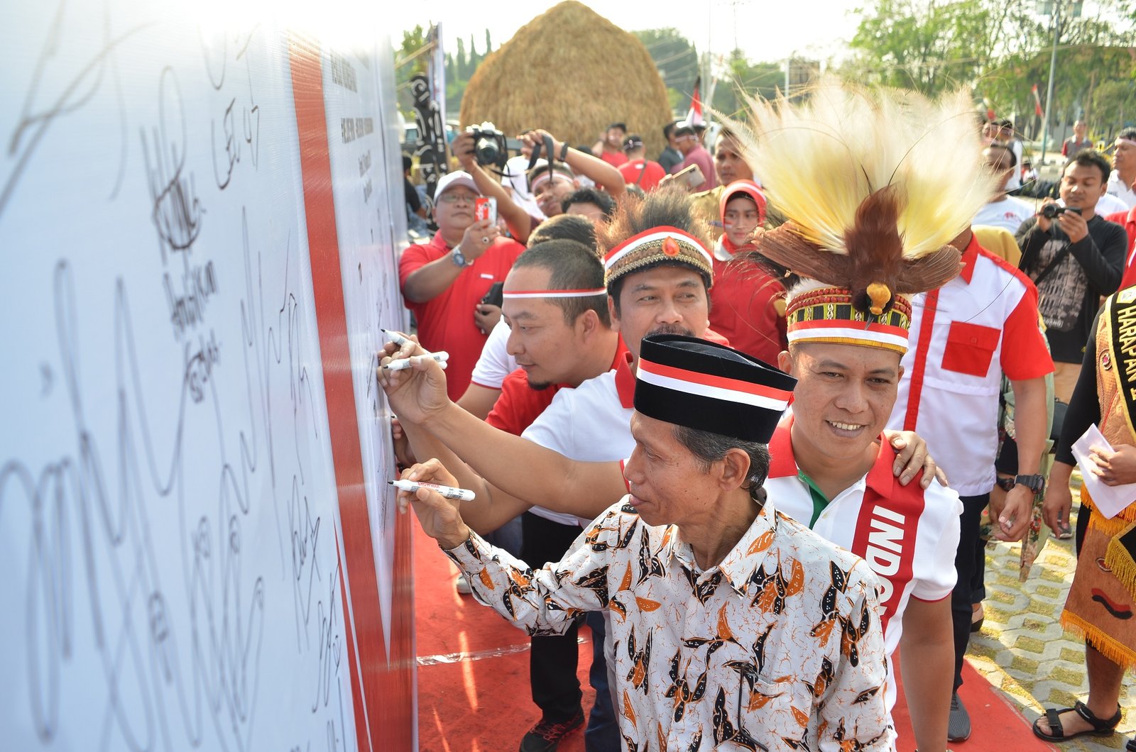 Selain membacakan deklarasi dan menandatangani deklarasi, seluruh peserta diajak bersama-sama menyanyikan beberapa lagu wajib. Bahkan beberapa peserta yang berpakaian ala masyarakat Papua, mengajak semua hadirin untuk menyanyikan lagu Papua Sajojo sambil menari massal. (san)
