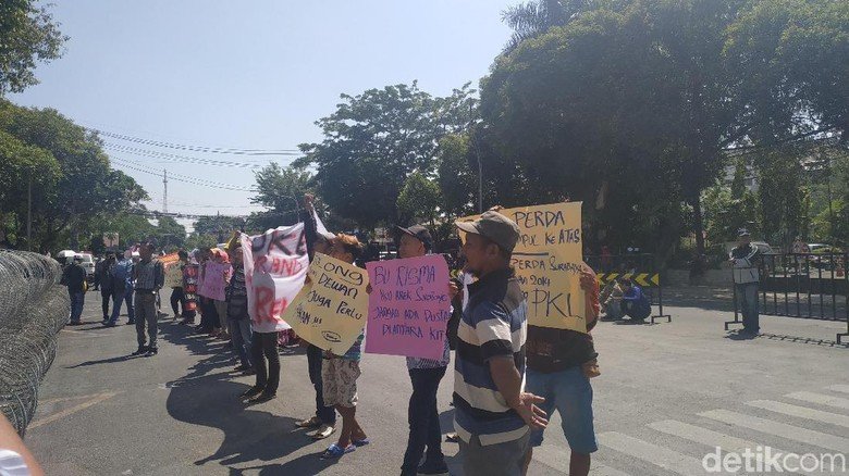 Sejumlah PKL menggelar demo di depan DPRD Surabaya. Mereka menolak relokasi yang akan dilakukan hari ini oleh Satpol PP. Demo dimulai sekitar pukul 09.00 WIB. Sekitar 30 menit berselang, salah seorang anggota dewan, Khusnul Khotimah mengajak perwakilan PKL berdiskusi dengan Ketua DPRD Surabaya, Adi Sutarwijono.