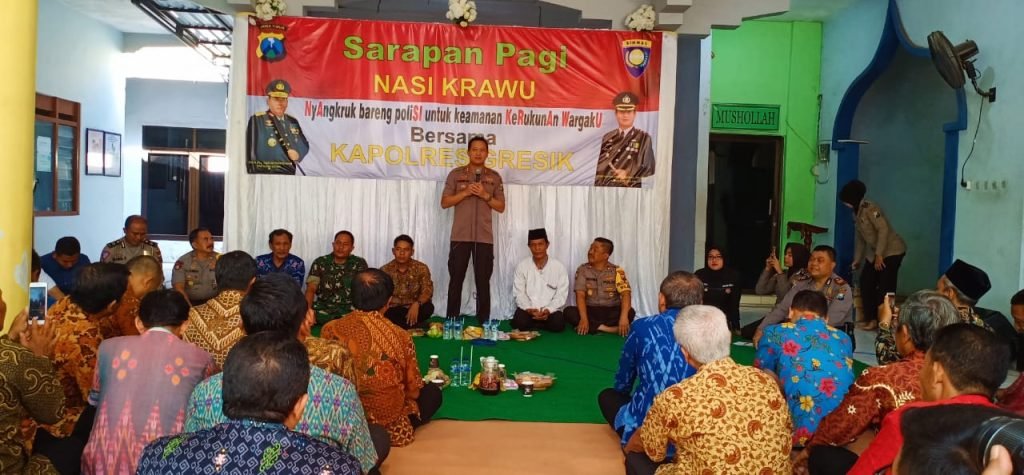 Setelah menyoalisasikan program itu ke sejumlah komunitas profesi, Kapolres AKBP Kusworo Wibowo mulai menyebarkan programnya ke tingkat desa dengan menggelar makan pagi Nasi Krawu untuk kades, lurah, tokoh masyarakat, tokoh agama seluruh Kecamatan Kebomas di Balai Desa Kembangan, Rabu (2/10) pagi.