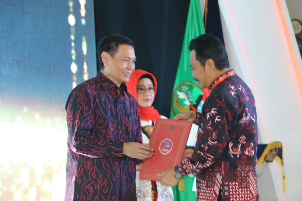 Penghargaan diserahkan Dirjen Hak Asasi Manusia, Dr. Mualimin Abdi kepada Wakil Bupati Gresik Dr. Moh. Qosim, di Gedung Merdeka, Kota Bandung, Jawa Barat, Selasa (10/12).