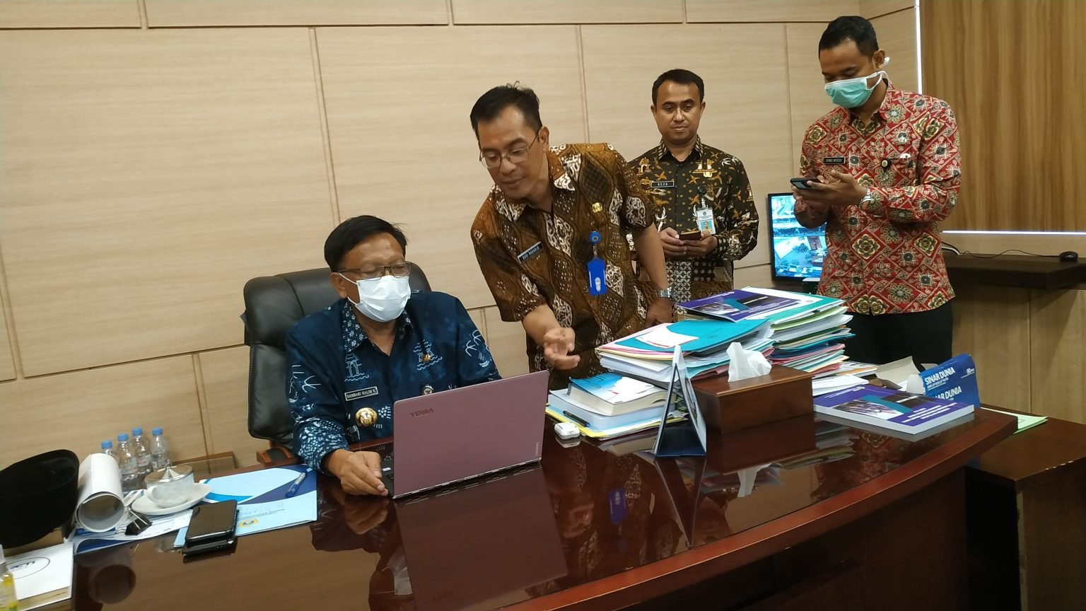 “Selamat pagi Pak Camat. Sedang apa kok tampak banyak orang di satu ruangan?.” Tanya Bupati Sambari.
