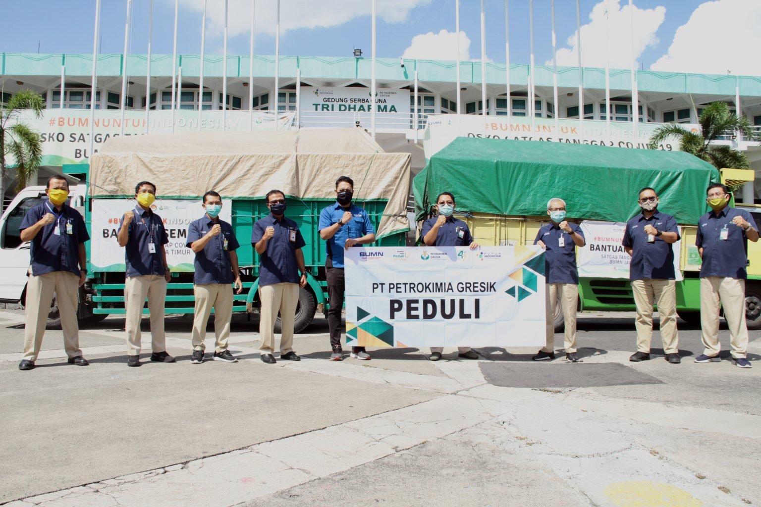 Bantuan sembako berupa 12 ton beras dan 400 boks mie instan secara simbolis diserahkan Direktur Keuangan, Sumber Daya Manusia & Umum Petrokimia Gresik, Dwi Ary Purnomo kepada Ketua Yayasan Madura Peduli Indonesia, Umar Wachidin di Posko Command Center BUMN Jatim di Sarana Olahraga Tri Dharma Petrokimia Gresik, Senin (27/4).