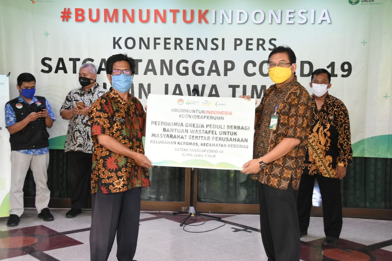 Secara simbolis bantuan diserahkan Ketua Tim Posko Command Center Satgas Tanggap Covid-19 BUMN Jatim, Bachronsyah, di Sarana Olahraga Tri Dharma Petrokimia Gresik.