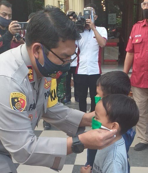 “Selain sosialisasikan mengenai protokol kesehatan bagi pengunjung, warga pengguna kendaraan yang melintas di jalan raya tidak menggunakan masker, kita bagikan masker.” jelas perwira dengan melati dua warna kuning di pundaknya itu.