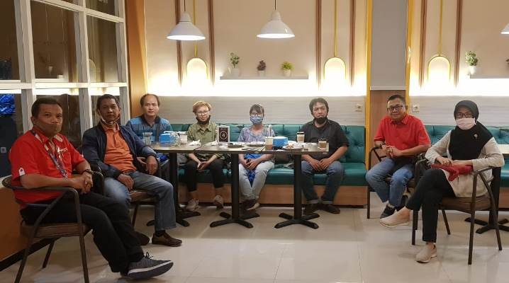 SURABAYAONLINE.CO-Menyambung tali silaturahmi segenap pengurus Ikatan Wartawan Online Jatim (IWO) Jatim yang dipandegani Ir Satwiko Rumekso (kedua dari kiri) bertemu dengan Edy Joko Sulistyo Herlambang (kedua dari kanan) Manager Sekdiv & Public Relation PT Telekomunikasi Indonesia TBK Divisi Telkom Regional V Jawa Timur & Bali, Nusra di sebuah kafe di kawasan Ketintang. Dalam kesempatan itu baik IWO Jatim maupun Telkom berbagi informasi mengenai keadaan terkini khususnya soal Covid-19 dan implikasinentuya bagi warga masyarakat. Untuk kedepannya IWO Jatim-Telkom akan bekerjasama dalam hal sosialisasi tentu yang berkaitan dengan kompetensi masing-masing.(*)