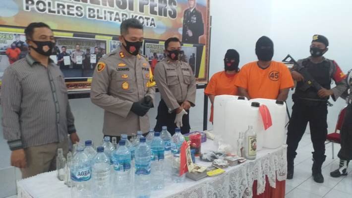 SURABAYAONLINE.CO-Akhirnya Pasutri penjual miras Oplosan di jadikan tersangka, setelah di lakukan pemeriksaan oleh Sat.Reskrim Polres Blitar Kota, hal itu di sampaikan Kapolres Blitar Kota AKBP.Leonard M Sinambela SH.SIK pada Konferensi Pers yang di gelar Kamis (3/9) siang.