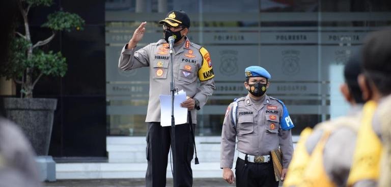 Kapolresta Sidoarjo Kombes Pol. Sumardji memimpin langsung Apel Pergeseran Pasukan Pengamanan TPS Pilkada Kabupaten Sidoarjo 2020 di Mapolresta Sidoarjo. Usai apel, kelengkapan personel Pam TPS juga dicek Kapolresta Sidoarjo. Seperti borgol, tongkat, jas hujan, senter, serta juga kelengkapan protokol kesehatan dan Alat Pelindung Diri.