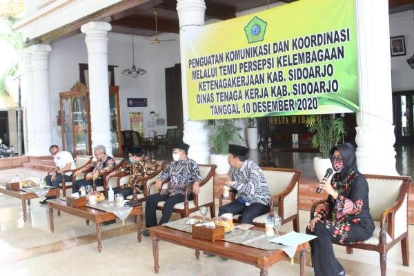 SURABAYAONLINE.CO-Pemerintah Kabupaten Sidoarjo undang buruh dan pengusaha di pendopo Delta Wibawa, Kamis, (10/12). Tujuannya untuk menguatkan komunikasi dan koordinasi antar lembaga ketenagakerjaan tersebut. Kegiatan penguatan melalui temu persepsi tersebut dibuka oleh Pj. Bupati Sidoarjo Dr. Hudiyono M.Si. Hadir Ketua DPRD Sidoarjo H. Usman, Kepala Dinas Tenaga Kerja dan Transmigrasi Provinsi Jawa Timur Himawan Estu Bagijo serta Ketua Konfederasi SPSI Jawa Timur Achmad Fauzi, Kepala Dinas Tenaga Kerja Sidoarjo Feny Apridawati dan Kasat Intelkam Polresta Sidoarjo AKP Meby Trisono.
