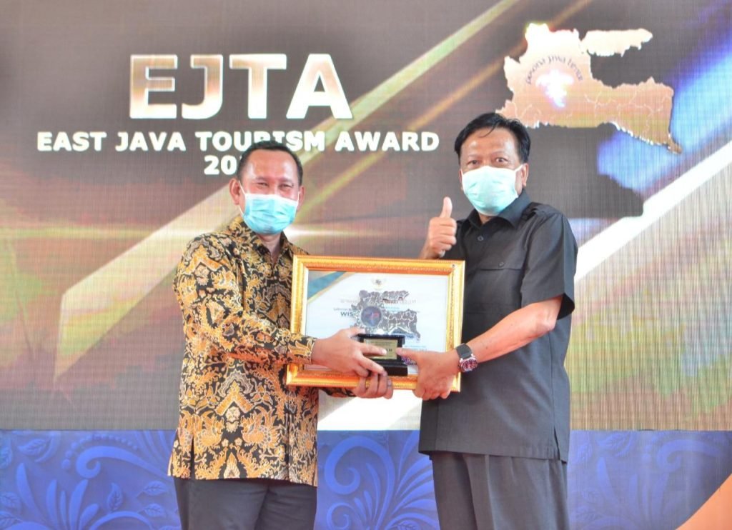 Penghargaan diterimakan Asisten III Pemprov Jatim Abimanyu Poncoatmojo Iswinarno, kepada Bupati Sambari Halim Radianto pada acara penganugerahan East Java Tourism Award 2020 di Wisata Bahari Paciran Lamongan, Minggu (20/12) siang.