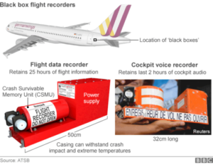 “Kotak hitam” terdiri dari dua peralatan terpisah: perekam data penerbangan (FDR) dan perekam suara kokpit (CVR). Mereka wajib ada di penerbangan komersial atau jet perusahaan, dan biasanya disimpan di bagian belakang pesawat, di mana mereka lebih mungkin untuk selamat dari kecelakaan.