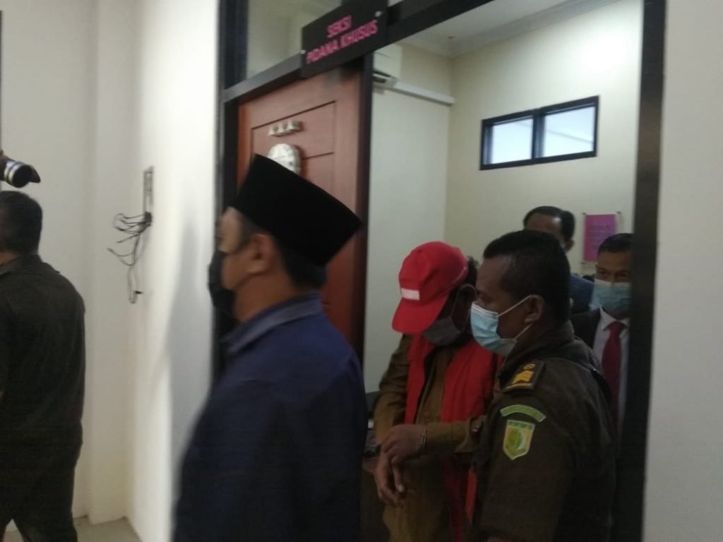 Ketika keluar dari ruang penyidik Kejaksaan Negeri (Kejari) Gresik, Suropadi mengenakan rompi orange dengan kedua tangan diborgol.