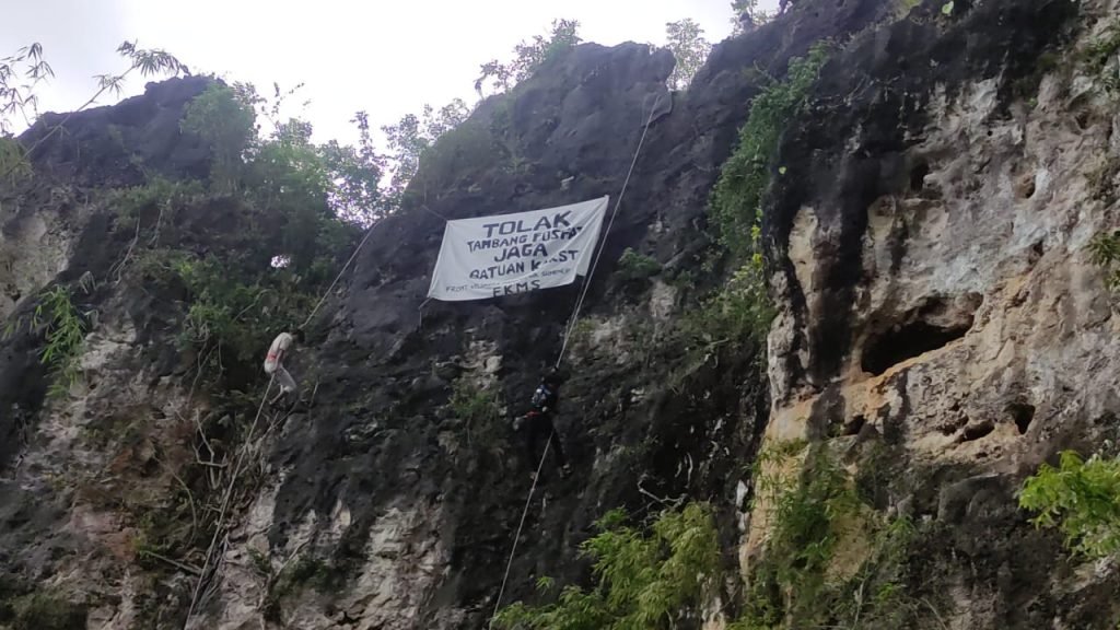 Spanduk berwrna putih itu bertuliskan “Tolak tambang fosfat jaga bebatuan karst,” ini terbang tepat di gugusan bebatuan karst desa Gedang-gedang, Kecamatan Batuputih, Kabupaten Sumenep