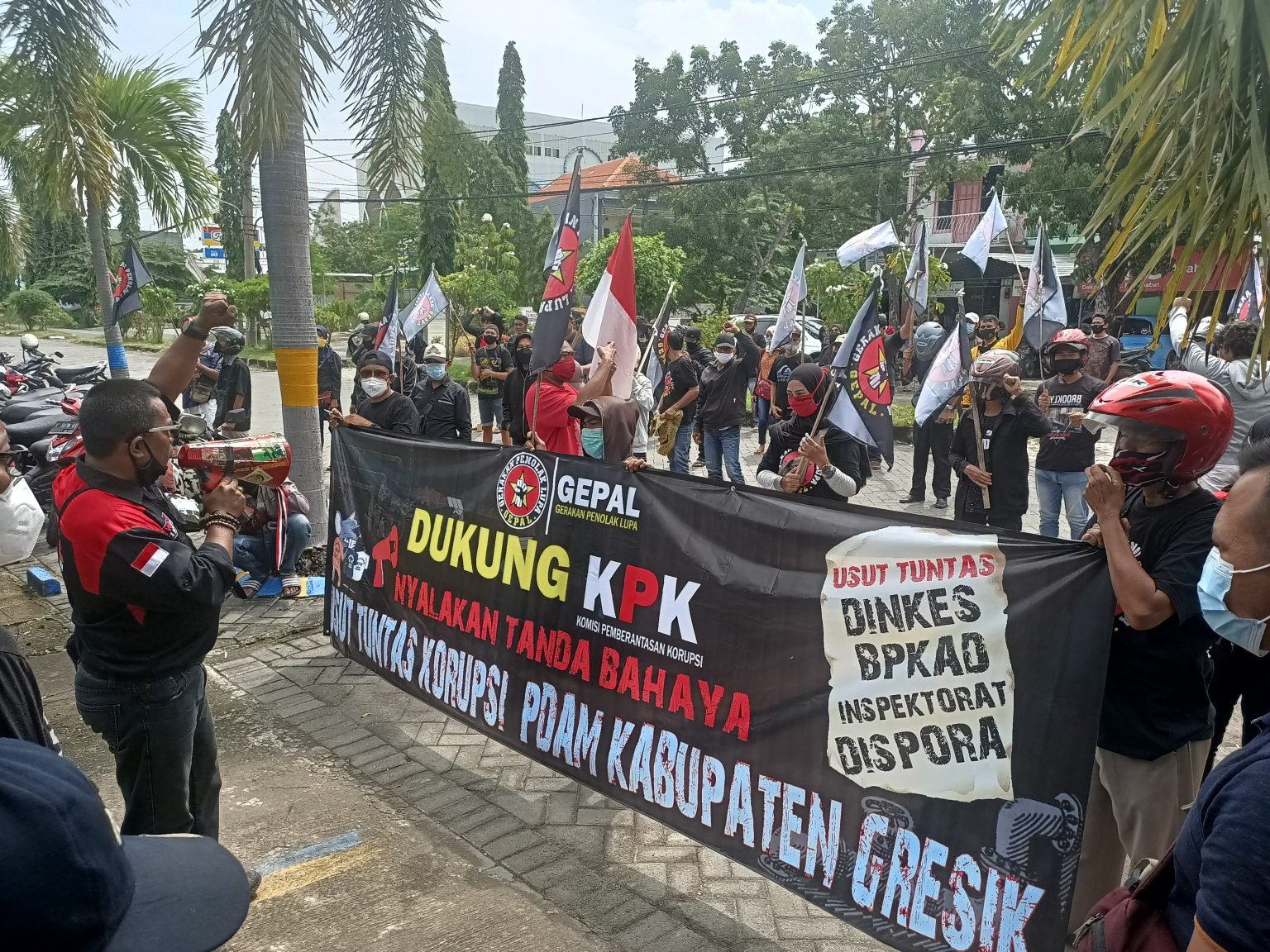 SURABAYAONLINE.CO, GRESIK – Gerakan Penolak Lupa (Gepal) menggelar aksi demo di Perumda Giri Tirta Gresik, Jalan Raya Permata Kecamatan Kebomas, Kamis (8/4), sebagai dukungan untuk Komisi Pemberantasan Korupsi (KPK) mengusut dugaan korupsi Rp 133 miliar di Perumda Giri Tirta.