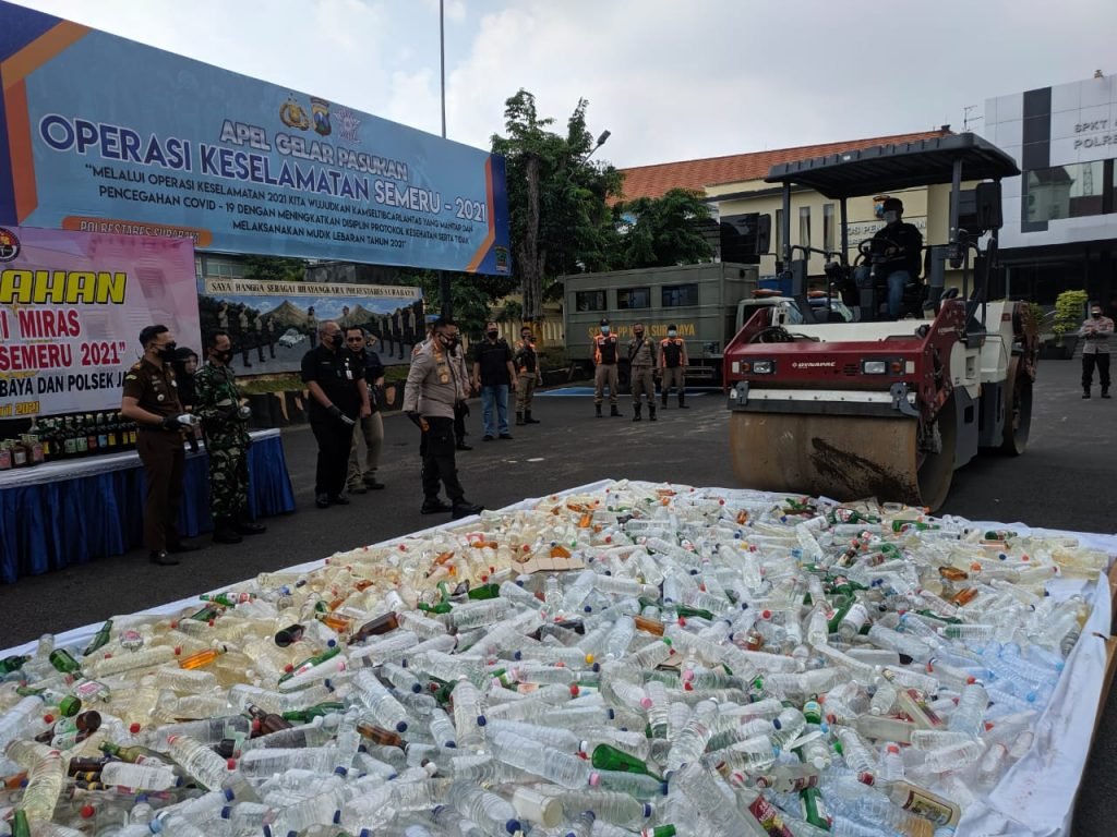 Surabaya online – Polrestabes Surabaya lakukan pemusnahan ribuan botol miras berbagai merk yang merupakan hasil dari Operasi Penyakit Masyarakat (Pekat) yang di laksanakan sejak tanggal 22 Maret sampai dengan 02 April 2021 yang lalu.