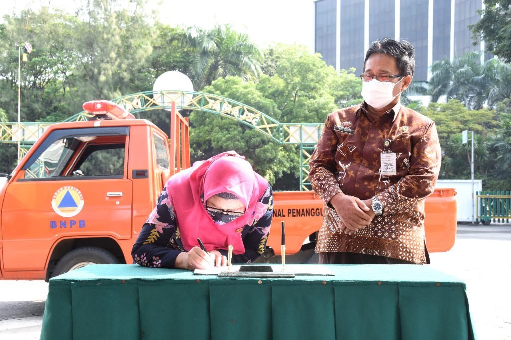 Secara simbolis bantuan diserahkan IIP BUMN Jawa Timur, yang berada di bawah Koordinator Wilayah (Korwil) B kepada Badan Penanggulangan Bencana Daerah (BPBD) setempat, di SOR Tri Dharma Gresik, Jumat (16/4).