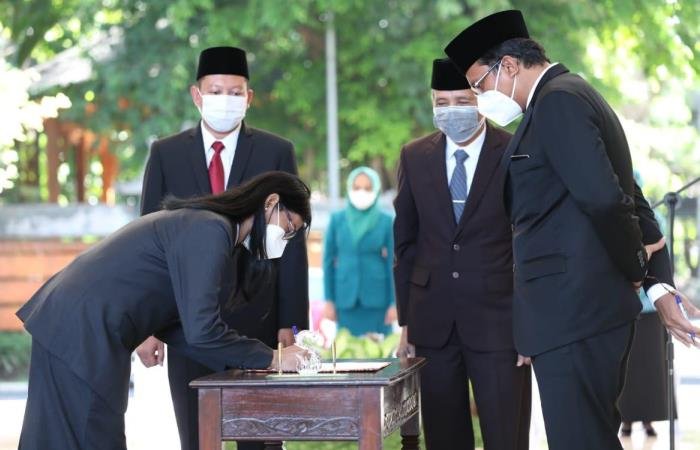 Pejabat yang baru dilantik diminta menandatangani Pakta Integritas perjanjian kinerja. Penandatangan disaksikan langsung Bupati Sidoarjo.
