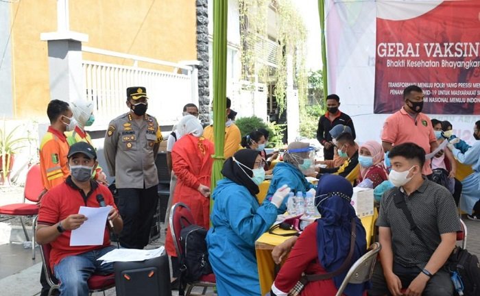 Kapolresta Sidoarjo Kombes Pol. Kusumo Wahyu Bintoro menyampaikan pelaksanaan vaksinasi Covid-19 tahap dua berjalan aman dan lancar. Sehingga melalui upaya percepatan vaksinasi ini, ia optimis segera terbentuknya herd immunity bagi masyarakat di tengah menghadapi pandemi Covid-19.