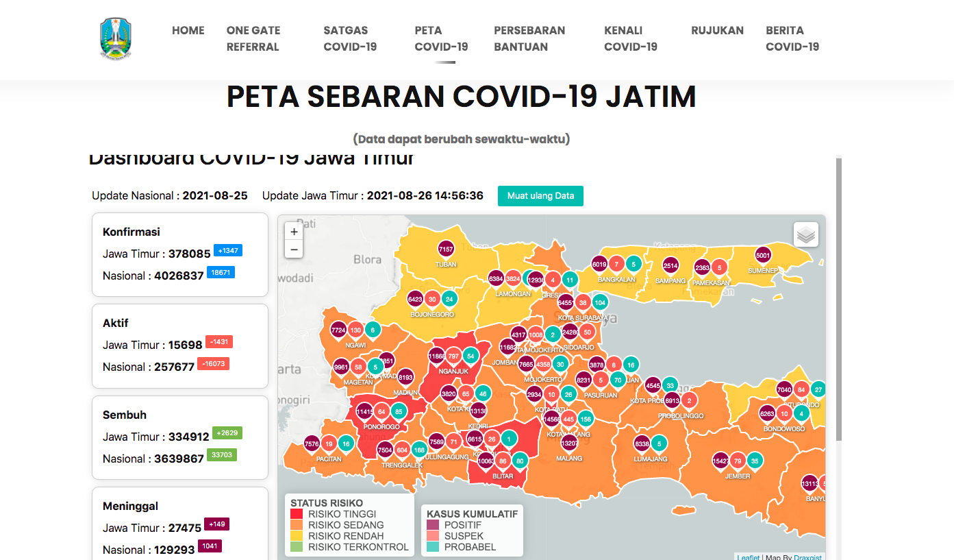 Gubernur Khofifah Indar Parawansa menjelaskan pada Rabu malam (25/8) mengutip dari web satgas Covid-19 empat dari 38 Kabupaten/Kota di Jawa Timur berstatus zona merah (risiko tinggi), 25 berstatus zona oranye(risiko sedang) dan sembilan berstatus zona kuning(risiko rendah).