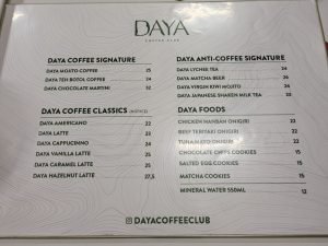 Untuk menu yang ada di Daya Cofffee ini sangat beragam loh, harga minumannya pun berkisar 22 ribu hingga 32 ribu dan untuk makanan di Daya Coffee berkisar 15 ribu hingga 22 ribu cukup terjangkau bukan mengingat lokasi cafe ini ditengah kota surabaya yang sangat mudah ditemukan.