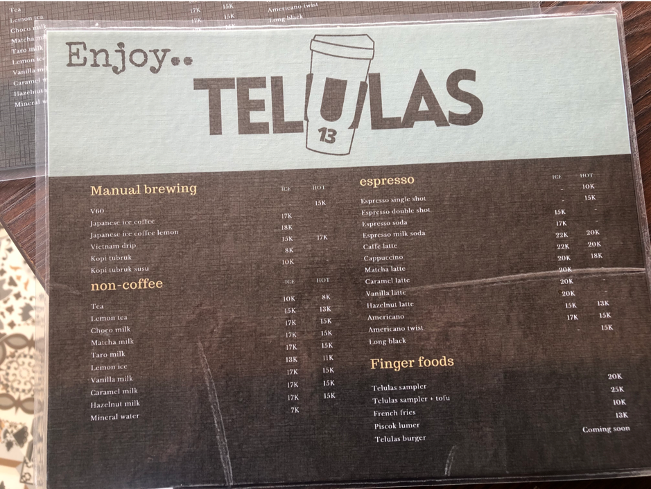 Apalagi di Surabaya, coffee shop kini kian menjamur. Hal ini pun juga menjadi kabar baik karena kopi lokal semakin melebarkan sayap di pasar dalam negeri. Salah satunya adalah Telulas Cafe, yang terletak di Jl. Raya Lidah Wetan No.10b, Mojo Kopek, Lidah Wetan, Kec. Lakarsantri, Kota SBY, Jawa Timur 60213.
