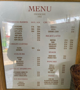 Sebuah kafe tidak akan lengkap tanpa menu-menu yang ditawarkan, sama kaya do Indische 1931 caffee, Menu makanannya asik-asik loh bestie. Jadi yang dijual antara lain kayak pancake vanilla, butter lemon chicken, french fries, onion ring, dan masih banyak lagi snack atau makanan berat lainnya.