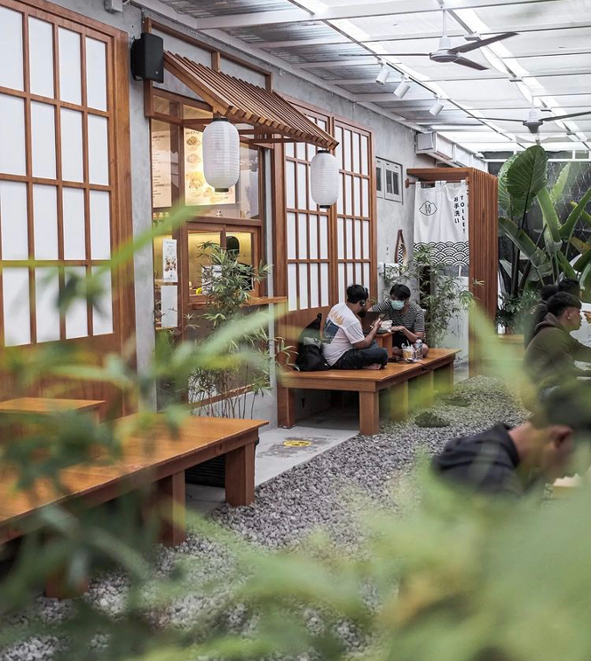 Tempat unik yang satu ini memiliki dua pilihan ruangan indoor dan ruangan outdoor yang sama – sama memiliki desain menarik. Ada berbagai hiasan ornamen seperti bangunan yang terbuat dari kayu, pintu geser dan lentera – lentera yang dipasang di sudut ruangan yang menimbulkan kesan minimalis dan natural. Ejji siap menerima pelanggan setiap hari pukul 07.00 – 21.00 WIB.
