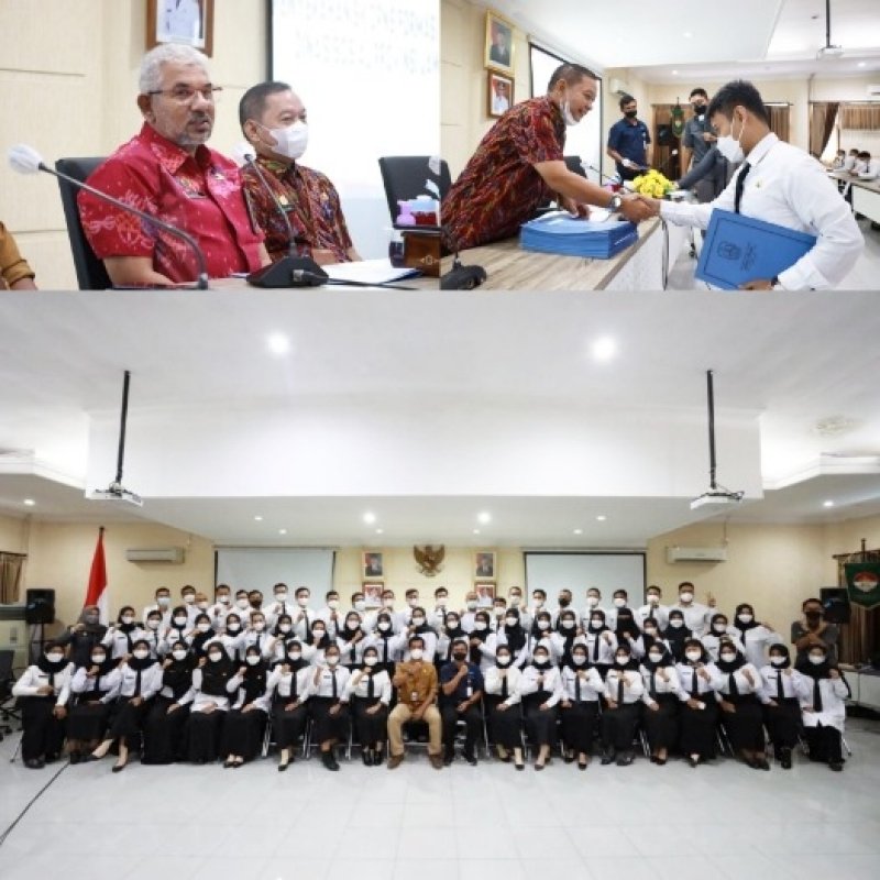 SURABAYAONLINE.CO – Kepala Dinas Sosial (Kadinsos) Jatim, Dr Alwi MHum, menyerahkan Surat Keputusan (SK) Calon Pegawai Negeri Sipil (CPNS) di lingkungan Dinsos Provinsi Jatim kepada 62 CPNS formasi tahun 2021, Selasa (5/4/2022).
