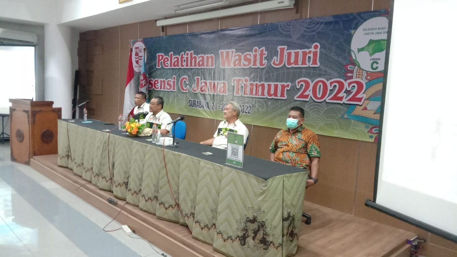 SURABAYAONLINE.CO – Sebanyak 70 orang dari 27 Kabupaten – Kota se Jatim mengikuti pelatihan wasit dan juri lisensi level C tingkat provinsi dan level B nasional di Graha Widya bakti Stesia Surabaya, Sabtu – Minggu 21-22 Mei 2022. Pelatihan ini untuk meningkatkan kuantitas, kualitas dan keahlian wasit dan juri di Jatim.