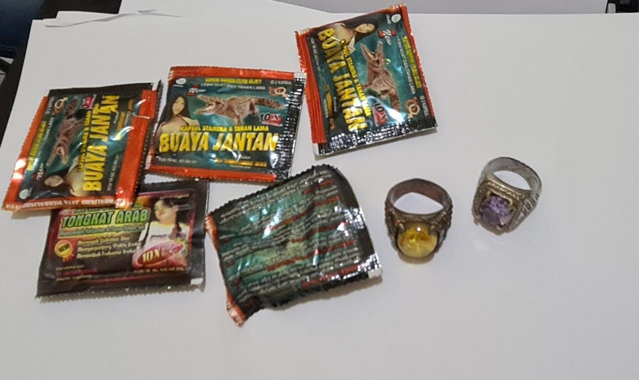 Dan dua buah cincin warna ungu dan kuning, Satu lembar uang pecahan Rp 50 ribu, Lima bungkus obat kuat yang digunakan sebelum melakukan persetubuhan, Satu unit mobil Suzuki Ertiga warna putih Nopol M-1545-TA milik pelaku.