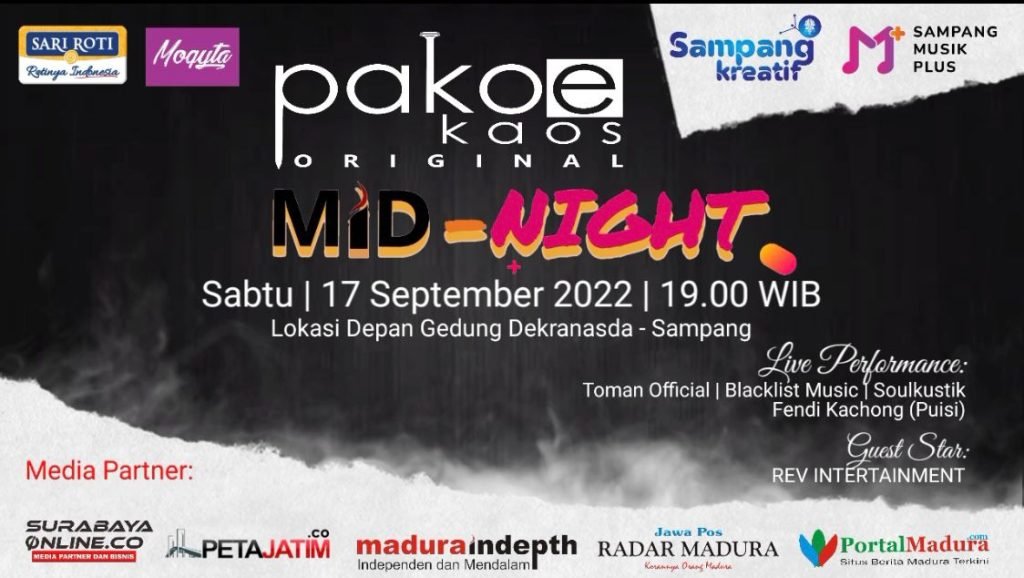 Event MID-Night dihelat untuk membangkitkan perekonomian masyarakat Sampang melalui dunia musik. Bahkan akan dimeriahkan dari berbagai kalangan musik lokal. Diantaranya Toman Official, Blacklist Music, Soulskustik, Fendi Kachong (Puisi). Guest Star, Rev Intertainment.