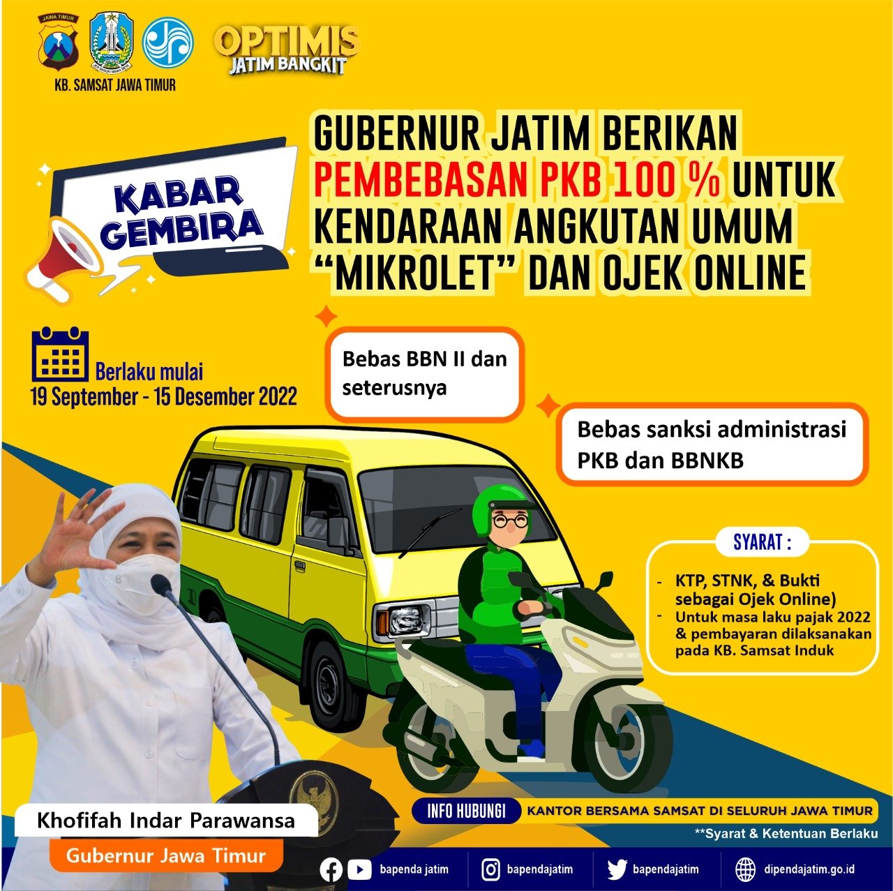 Kebijakan tersebut diterapkan untuk seluruh angkutan umum orang jenis mikrolet dan ojek online plat Jawa Timur yang jatuh tempo mulai hari ini tanggal 19 September hingga 31 Desember 2022. Untuk mendapatkan insentif pajak nol rupiah tersebut, wajib pajak dapat mendaftarkan kendaraannya di KB Samsat setempat, mulai hari ini tanggal 19 September hingga 15 Desember.