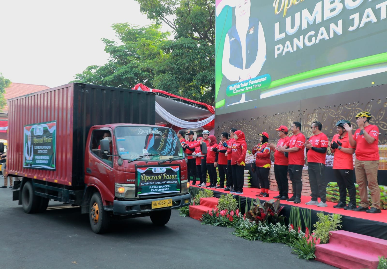 SURABAYAONLINE.CO – Gubernur Jawa Timur Khofifah Indar Parawansa melepas dan memberangkatkan puluhan truk yang mengangkut komoditas kebutuhan bahan pokok untuk kegiatan Operasi Pasar Lumbung Pangan Jatim di 25 titik pasar yang menjadi sampling BPS.