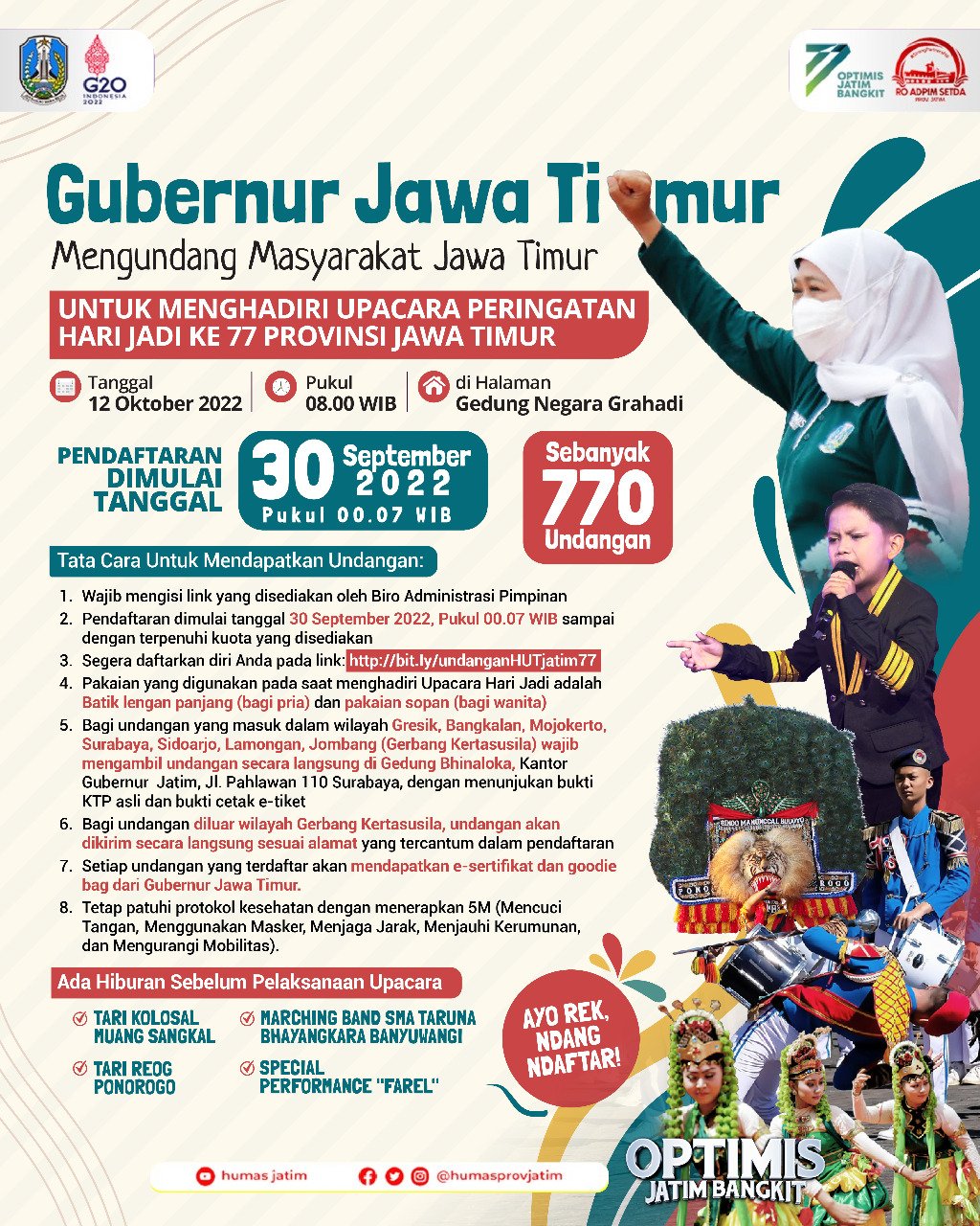 Untuk mendapatkan kuota undangan, masyarakat diwajibkan mendaftarkan diri pada link https://bit.ly/undanganHUTjatim77 yang dapat diakses mulai 30 September 2022 pukul 00.07 WIB sampai dengan terpenuhi kuota yang disediakan.