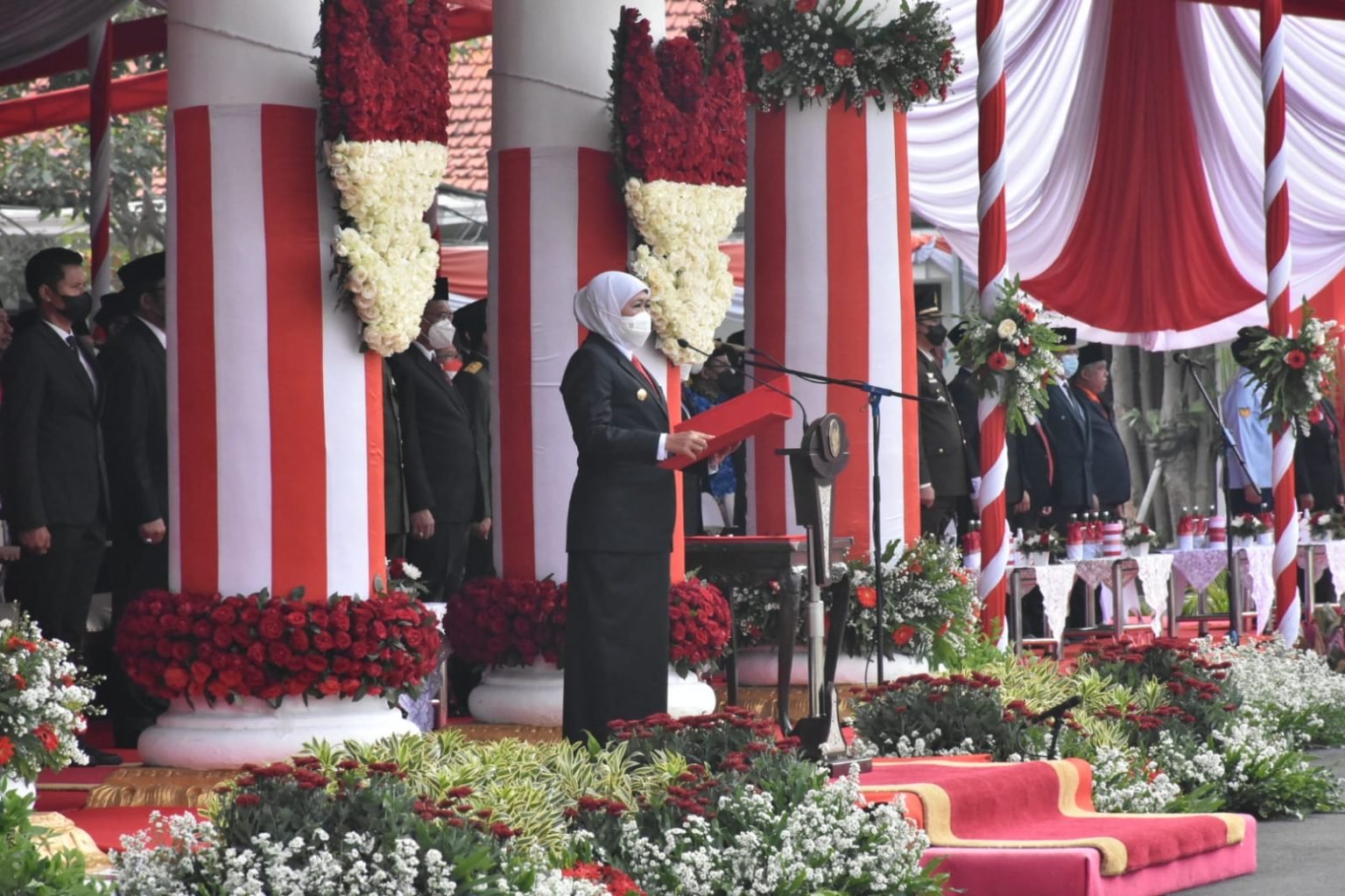 “Saya yakin, dengan mengamalkan, mengimplementasikan dan menjalankan nilai-nilai luhur Pancasila seperti gotong royong, persatuan, empati, dan solidaritas antar sesama, segala tantangan dan kesulitan Insya Allah bisa dihadapi Bangsa ini dengan ketangguhan dan kebersamaan, kata Khofifah usai menjadi Inspektur Upacara Peringatan Hari Kesaktian Pancasila Tahun 2022 di Halaman Gedung Negara Grahadi Surabaya, Sabtu (1/10).