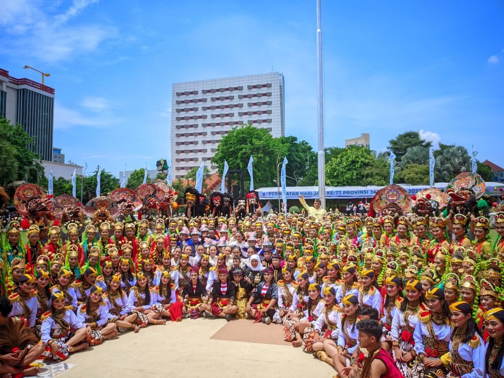 Upacara peringatan HUT Jawa Timur ke-77 dimeriahkan dengan tarif kolosal yang merupakan perpaduan tim penari mulai dari jaranan, muang sangkal, reog Ponorogo, hingga tim marching band.