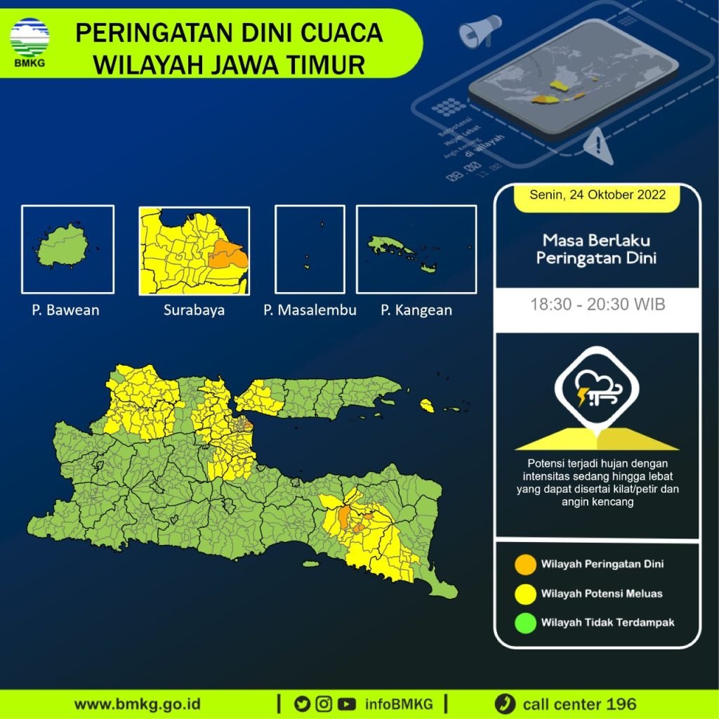 Dikatakan, beberapa wilayah yang patut diwaspadai memiliki potensi cuaca ekstrem yang dapat mengakibatkan bencana hidrometeorologi periode 24-30 Oktober 2022, yaitu di wilayah Surabaya, Sidoarjo, Gresik, Lamongan, Bojonegoro, Tuban, Kab. Mojokerto, Jombang, dan Nganjuk.