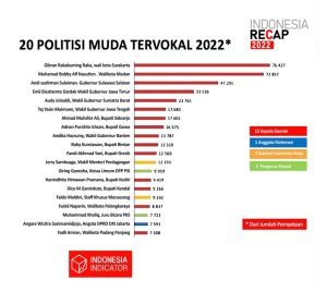 Politisi muda terpopuler yang menduduki nomor 1 yakni putra Presiden Joko Widodo yang saat ini menjabat Wali Kota Surakarta (Solo) Gibran Rakabuming. Dari unggahan di akun twitternya @gibran_tweet ia memposting hasil survey Indonesia Indicator dalam Indonesia Recap 2022. Kepopuleran Gibran disusul Wali Kota Medan Muhammad Bobby Alf Nasution yang tak lain adik iparnya sendiri. Kemudian ada nama Taj Yasin Maimoen Wagub Jawa Tengah putra Syaikhona KH. Maimun Zubair berada di urutan ke 6 dan ada Fandi Akhmad Yani Bupati Gresik juga masuk dalam jajaran politisi muda terpopuler diurutan ke 11.