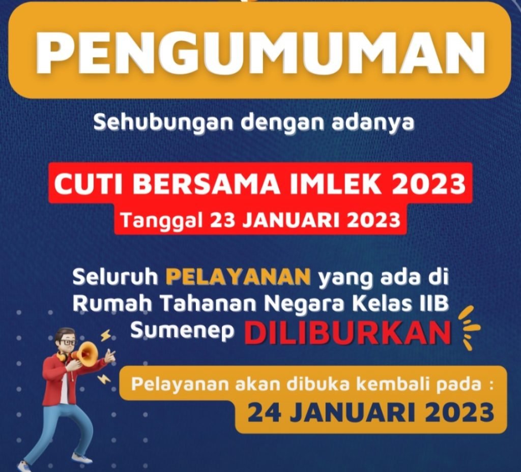 SURABAYAONLINE.CO, Sumenep – Pelayanan Kantor Rumah Tahanan Negara (Rutan) Kelas IIB Sumenep, Madura, Jawa Timur diliburkan pada cuti bersama tanggal 23 Januari 2023.