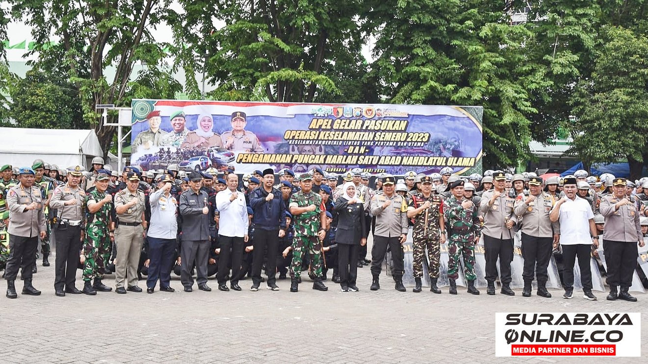 SURABAYAONLINE.CO, Sidoarjo –  4.500 anggota gabungan diterjunkan untuk menjaga keamanan kegiatan akbar resepsi 1 abad NU yang digelar di GOR Sidoarjo besok Selasa tanggal 7 Februari 2023. Siang tadi, seluruh personil gabungan disiagakan. Mulai dari Polri, TNI, Satpol PP, Dishub serta Banser. Mereka mengikuti apel gelar pasukan operasi keselamatan Semeru 2023 sekaligus pengamanan puncak Harlah 1 abad NU di parkir Timur GOR Sidoarjo, Senin, (06/02/2023). Apel dipimpin Gubernur Jawa Timur Hj. Khofifah Indar Parawansa dan dihadiri Kapolda Jatim Irjen Toni Harmanto, Pangdam V Brawijaya Mayjen TNI Farid Makruf serta Kabinda Jatim Brigjen TNI Fahmi Sudirman. Tidak ketinggalan Bupati Sidoarjo H. Ahmad Muhdlor S.IP selaku tuan rumah peringatan 1 abad NU.