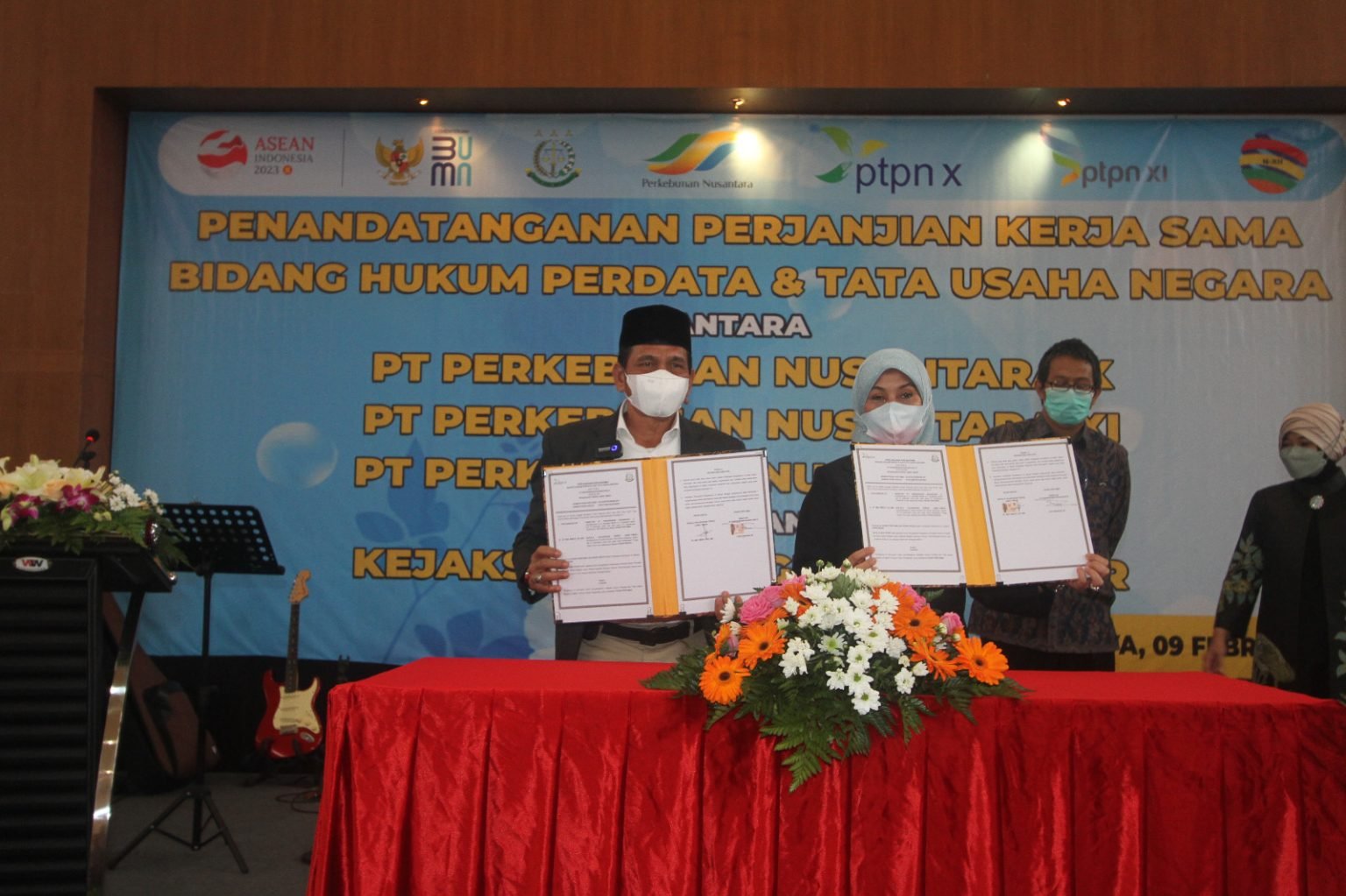 SURABAYAONLINE.CO – PT Perkebunan Nusantara (PTPN) X bersama PTPN XI dan PTPN XII melakukan penandatanganan Perjanjian Kerjasama Bidang Hukum Perdata dan Tata Usaha Negara dengan Kejaksaan Tinggi (Kejati) Jawa Timur, Kamis (9/2). Kerjasama ini meliputi pendampingan, pertimbangan, dan tindakan hukum oleh Kejati Jawa Timur hingga tahun 2025.