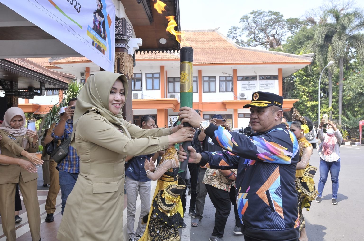 Begitu tiba di kantor Bupati Mojokerto, rombongan kirab obor Porprov Jatim VIII disambut dengan sejumlah penari sebelum berjalan menuju Pendopo Graha Maja Tama. Teguh Gunarko, lantas menyerahkan obor Porprov Jatim VIII ini kepada Bupati Ikfina Fahmawati.