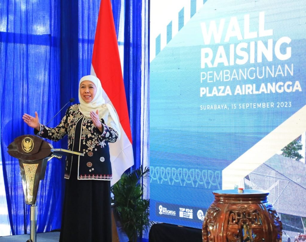 SURABAYAONLINE.CO, Surabaya – Gubernur Jawa Timur Khofifah Indar Parawansa meresmikan upacara Pengangkatan Tembok pembangunan Airlangga Plaza di Aula Kampus C Universitas Airlangga (UNAIR) Surabaya, Jum’at (15/9).