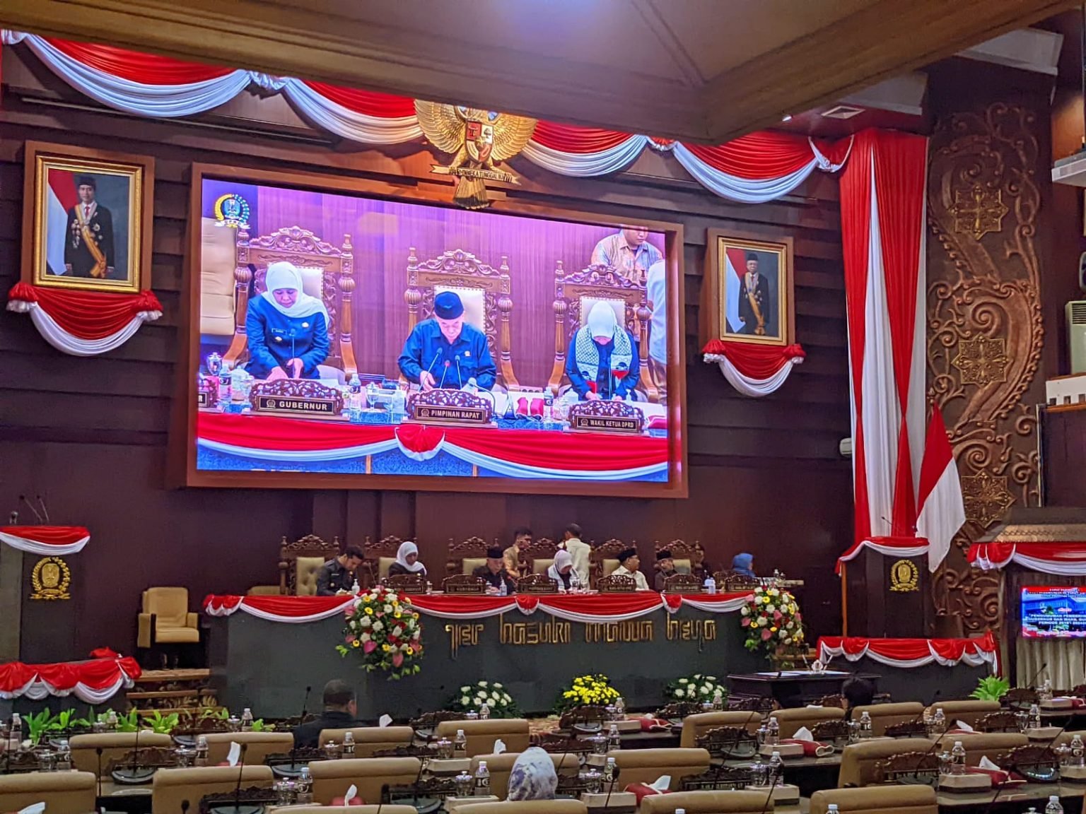 SURABAYAONLINE.CO, Surabaya – DPRD Provinsi Jawa Timur mengadakan rapat paripurna dimana pada rapat tersebut dihadiri oleh Khofifah sebagai gubernur dan Emil sebagai wakilnya, pada Senin (6/11).