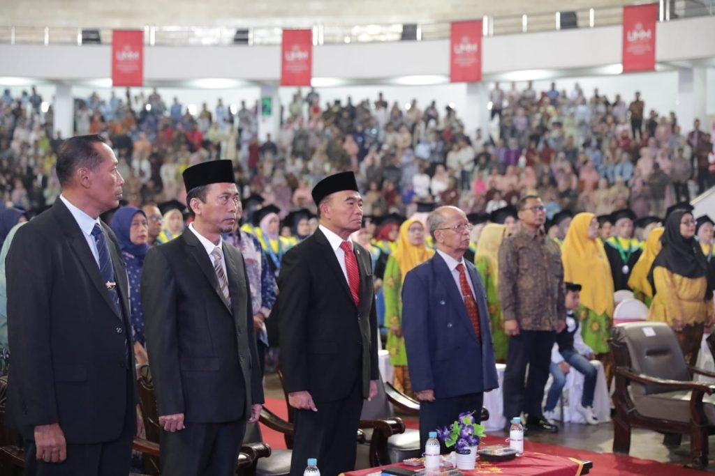 “Pagi ini saya menyaksikan wajah-wajah wisudawan yang ceria, optimis menatap masa depan, dan InsyaAllah wajah-wajah itu menggambarkan suasana hati suasana batin kalian untuk menuju masa depan cerah,” ujar Muhadjir Effendy.