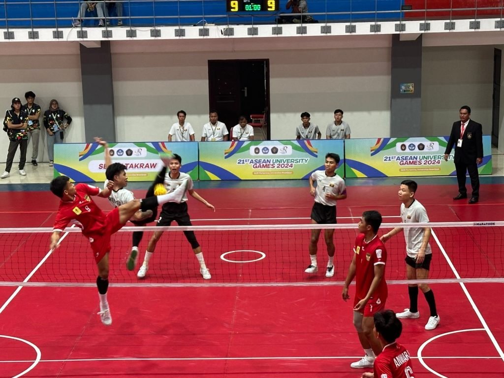 SURABAYAONLINE.CO, Malang – Takraw Kontingen Indonesia, mempersembahkan medali ke-79 untuk Merah Putih di 21st ASEAN University Games 2024 Surabaya-Malang. Keping emas tersebut dipastikan setelah Tim Indonesia A yang menumbangkan Myanmar dengan skor 2-0 (15-10, 17-14) pada final quadrant putra di GOR Pertamina, Universitas Brawijaya, Malang, Jawa Timur, Rabu (3/7/2024).