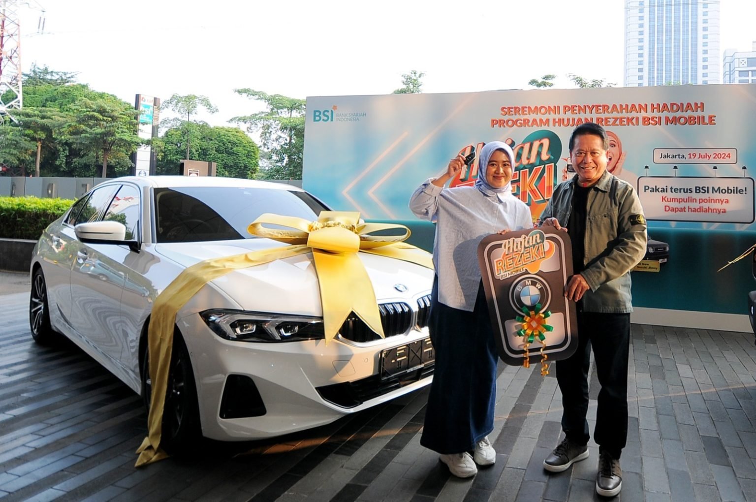 BSI menyerahkan hadiah utama BMW 320i Sport kepada nasabah Siti Rahmawati dan Mobil New Suzuki Jimny kepada M Nur, di Kantor Pusat BSI The Tower Jakarta, Jumat (19/7) lalu. “Ini (Program Hujan Rezeki BSI Mobile) merupakan bentuk apresiasi kami kepada nasabah yang telah mempercayai kami, khususnya dalam penggunaan BSI Mobile. Ini juga menjadi salah satu cara BSI untuk mendekatkan perbankan syariah kepada masyarakat sebagai sahabat finansial, sosial, dan spiritual,” kata Hery.