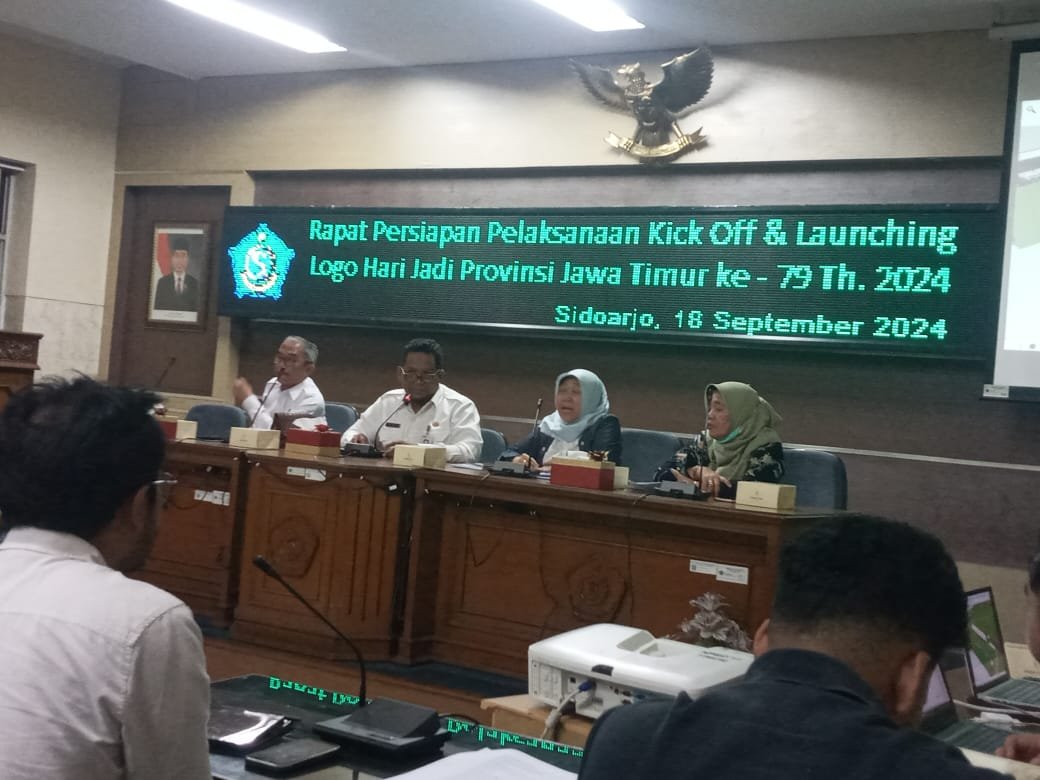 Rapat persiapan kick off dan launching logo peringatan Hari Jadi ke-79 Provinsi Jawa Timur digelar, Kemarin sore, Rabu, (18/9), di Ruang Rapat Delta Karya lantai 2 Setda Sidoarjo dipimpin oleh Asisten Pemerintahan dan Kesra Setda Sidoarjo M. Ainur Rahman.